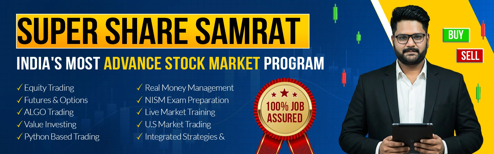 Objective of the Course: The Super Share Samrat (SSS) course is designed for individuals who aspire to build a full-time career as traders. This comprehensive program provides in-depth training across various trading segments, equipping you with the skills and expertise necessary to succeed in the competitive trading landscape.