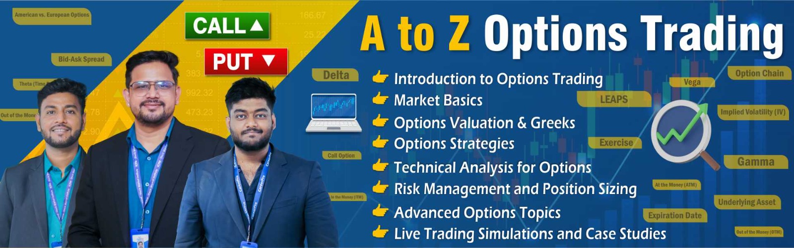 This course aims to provide comprehensive knowledge of options trading, from basic concepts to advanced strategies. Designed for aspiring traders, it covers practical skills, risk management, and real-world strategies that help develop an effective approach to options trading